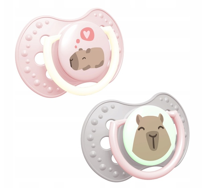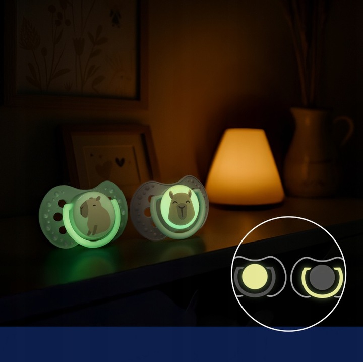 Jeden ze smoczków w zestawie posiada uchwyt, a drugi kapsel świecący w ciemności, co ułatwia znalezienie smoczka w nocy.