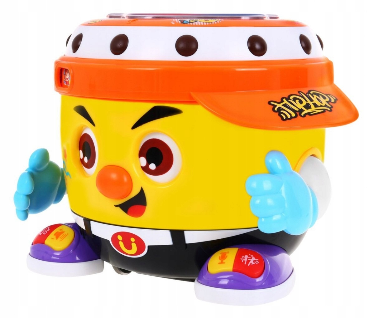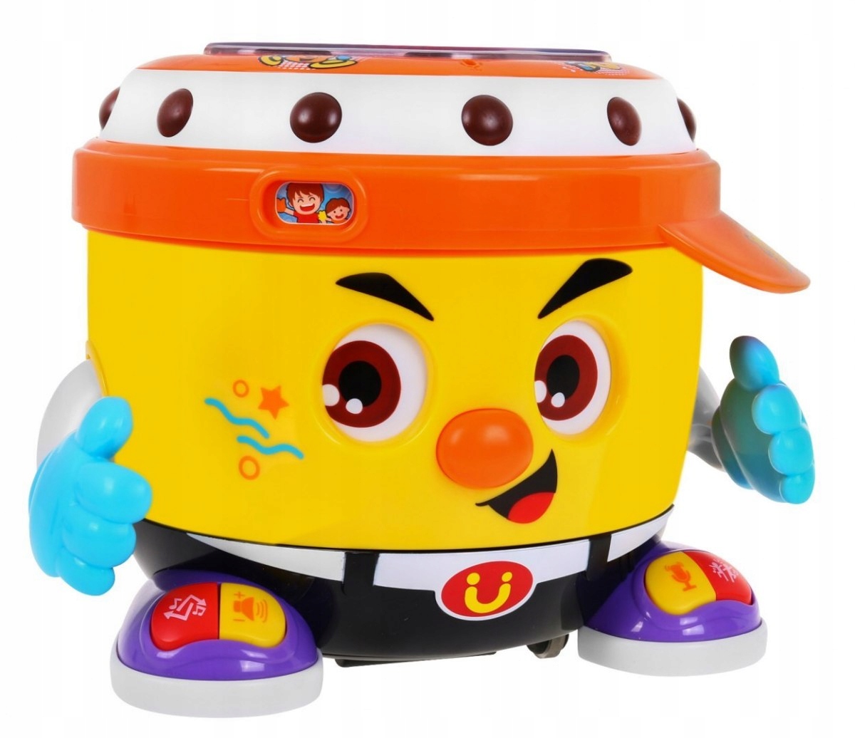 W górnej części bębenka znajduje się panel, w który dziecko może uderzać, a wydobywać się będą rytmy perkusji i migać światełka.